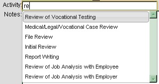 The space marked 'Activity:' is the brief description of what the note is. (ie Intake Interview, Phone Call, Report Generation, etc) The activity field is an autoselect field, and will suggest names from the database that match your typed input. You can select your choice from the popup suggestions any time, or can type in a new activity, and it will be remembered for future notes.