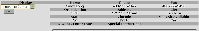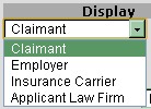 The area at the top of the case notes page where the header with 'Display Name Phone Fax' is showing is a handy information display for quick reference to client and contact data while creating or editing a case note. The menu under display allows you to choose which party to the case you are viewing information for. Only those parties that are actually filled in for the case will be included in the menu.