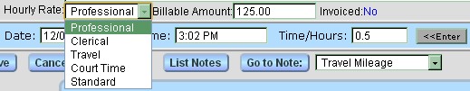 If the hourly rate menu selection is changed, the 'Billable Amount:' field is recalculated. The billable amount is also recalculated if the 'Time/Hours:' field is changed and you click or tab somewhere else, or if the '<<Enter' button in the case note timer is clicked.