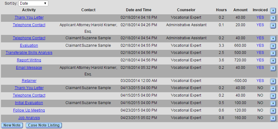 Case Notes are added to a case as it progresses, detailing activity that takes place for the case, tracking time spent on the case, and by whom, and generating billable events for the case. Notes should be added whenever billable time or services for a case occur, or when important information needs to be noted for a case. Notes may also be automatically added when a letter or report is generated, or when email is sent from Convergence, depending on your Convergence site settings. The term 'Case Notes' may be replaced by the admin user with a different name to fit your organization's business model. Billable amounts from case notes form the basis for generating invoices from Convergence.