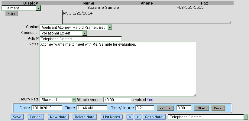 Clicking the button 'Stop' stops the timer, and the button becomes a 'Start' button which restarts the timer. The button 'Reset' sets the timer back to zero. The button '<<Enter' converts the time into hours, and recalculates the billable amount based on the number of hours times the selected hourly rate. The hours appear in the field marked 'Time/Hours:'. The fields 'Date:' and 'Time:' refer to the dat and time when this note activity occured.