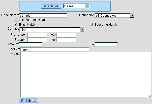 Clicking 'Find Notes' in the popup menu or the navigation page will bring you to a page to enter your search criteria and find case notes. You may restrict the search to a case, or search all cases. Any data field can be used to search with. For date fields, a date may be typed in, or a range of dates like "06/16/16 to 09/15/16", where the word 'to' indicates a range of dates.