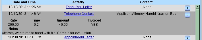 At the bottom of the case note entry area is a timer for tracking length of time a case activity takes. This timer can be left running during meetings, phone calls, or document preparation to accurately measure the amount of billable time expended. The timer may be paused and restarted if needed, and event times can be entered directly into the time field. When a time is entered, the Amount field will be filled according to the amount of time and the hourly rate selected.