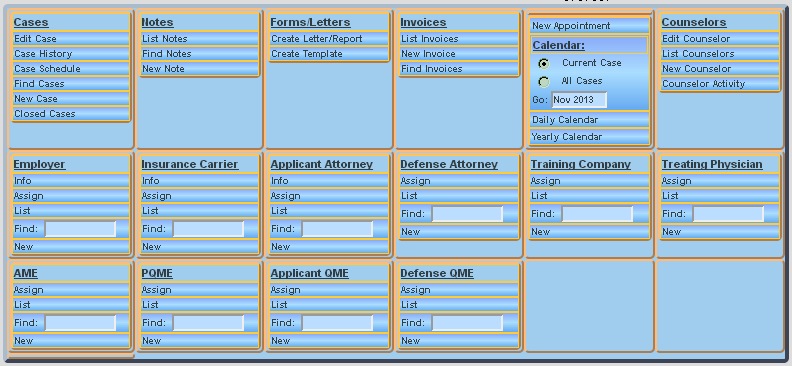 The 'Case List' button will take you to a master list of all cases you have the privilege to view. This list can be sorted by any data field, and has popup features for quickly finding more info, or uploading files to a case. For more details about the case list, click here.