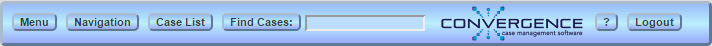 At the top of most Convergence pages is a top bar containing basic navigation features, including buttons for the popup menu, the navigation page, the master case list, finding cases quickly, and logging out. The 'Menu' button will bring you to the popup navigation menu shown below, a handy palette for getting around to most common Convergence functions. The 'Navigation' button accesses a full Convergence navigation page that has more functions than the menu popup, also documented below.