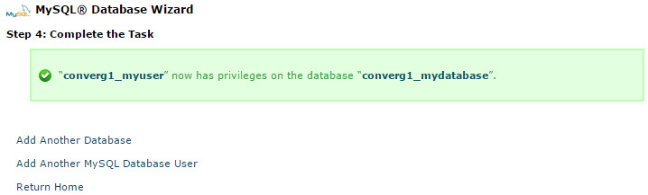 This example created a database named converg1_mydatabase with a user converg1_myuser and password Try4BeThis. All three of these items will be needed by the Convergence installer so Convergence can access this new database. You cna click on 'Return Home' to go back to the control panel front page.