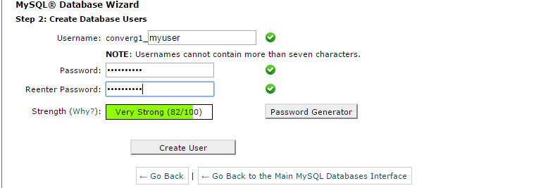You will then be asked for a user name and a password to access the database. Again, note any prefix to the user name, such as converg1_, because that will be part of the user name too. Your database password must be kept safe, as it can be used to access any of your Convergence data. Pay attention to the password strength indicator, and try to make it as strong a password as possible. Combining upper and lower case letters with numbers is usually a good idea. Be sure to make a note of the database user name and password you choose, since you will need them when you install Convergence. If you have trouble creating a strong password, the Password Generator button will do that for you. Be sure to note the password.