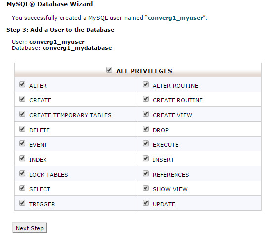 After you have set up a database user name and password, you will be prompted for user privileges. Simply check All Privileges, and Next Step. This should complete your database setup, and you should see a screen confirming your database and user names.