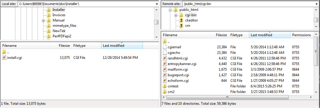 Once your hosting, domain, and SSL certificate are set up, it's time to upload the Convergence installer to your server. The installer should be uploaded with FTP to the cgi-bin directory in your web server directory. (usually a folder called www or public_html) The installer must be set to be executable by all with the FTP tool, and a MySQL database needs to be created to place Convergence's data into. Procedures illustrated below are using the FTP application FileZilla, which you may download and install on your PC for free, and CPanel at the server end, which we recommend as your hosting control panel. CPanel would be provided by your hosting service. Other FTP progams or hosting control panels will have similar features and can be used here as well.