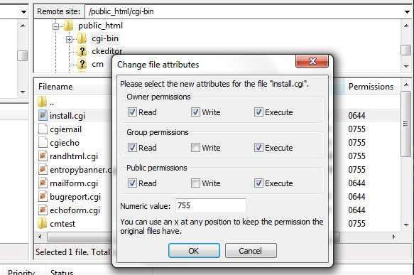 For the installer to run, it must have its execute permissions set. After dragging the install file to the server, right click on the installer file on the server side, and choose 'File permissions...'. When the permissions dialog box shows up, check all three Execute checkboxes and click OK.