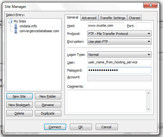Your hosting provider will supply you with a host and password for FTP access. You will want to use those to upload the installer to your server. Run the FileZilla FTP client, choose Site Manager from the File menu, and click on the button 'New Site'. There, place your FTP host name (usually either www.mydomain.com or ftp.mydomain.com) in the Host: field, and set Logon Type to 'Normal'. Type the user name and password into the fields below. Usually the Port: text field is left empty, but if your hosting info gives you an FTP port number other than 21, that should be entered into the Port field.