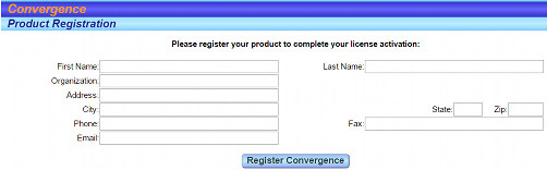 Once you accept the Convergence license, you will get a page asking you to provide basic info about your business that this license is for. At least a name or organization, and an email address must be filled in to complete registration.