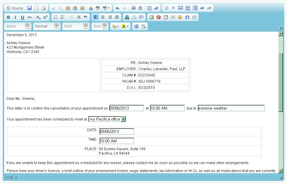 Editing document text does not change case data. For example, if you change a phone number in a document with this editor, it only changes this document, and the case record will still contain the unchanged number. Be sure to make changes to case or contact info in the edit case page, or the case contact page that has the phone number.