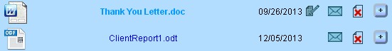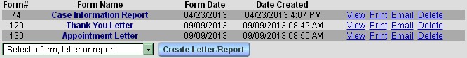 The page accessed through 'Create Letter/Report' in the popup menu, or through the 'Forms' link in case lists, gives you an alternate view of the file list for your case. This is also the page you return to after saving changes to a document. All template based files are listed in order regardless of what folder they may be in. In addition, the file directory is included on the page so that folders and uploaded files are visible to refer to.