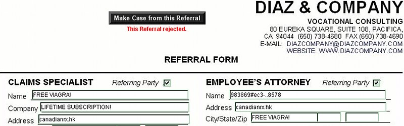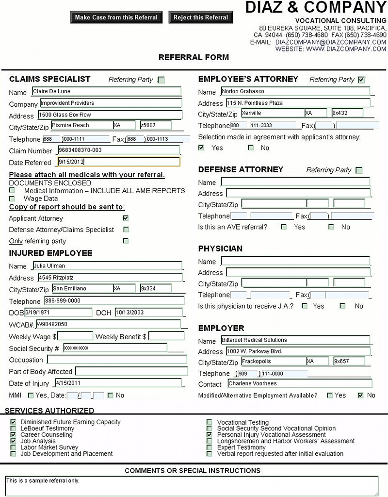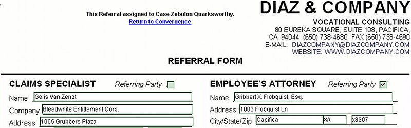 Below is a sample form that you might see when viewing an open referral. The Diaz & Company name and information would be replaced with your organization's information, entered by the admin user in Admin Preferences.