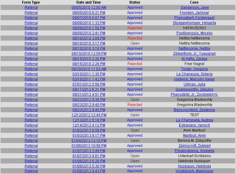 In the list, the links under 'Form Type' and 'Date and Time' will link you back to a page containing the actual referral data, with options to approve or reject if this referral isn't already approved. If a referral is approved, the client name in the 'Case' column is linked to the case that was made from that referral.